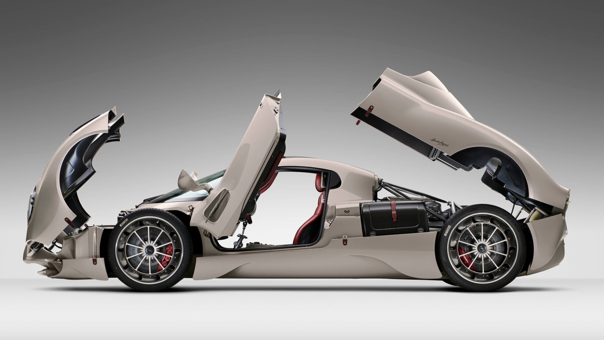 The carbon monocoque used on previous Pagani models sets the standard in terms of its strength, lightness and build quality. Pagani has chosen to consolidate its existing strengths, to improve how its fibers are woven and to constantly invent new composite materials such as Carbo-Titanium and Carbo-Triax. On top of that, a new type of A-class carbon fiber has been developed specifically for aesthetic applications such as the bodywork, providing 38% of additional stiffness with the same density.
